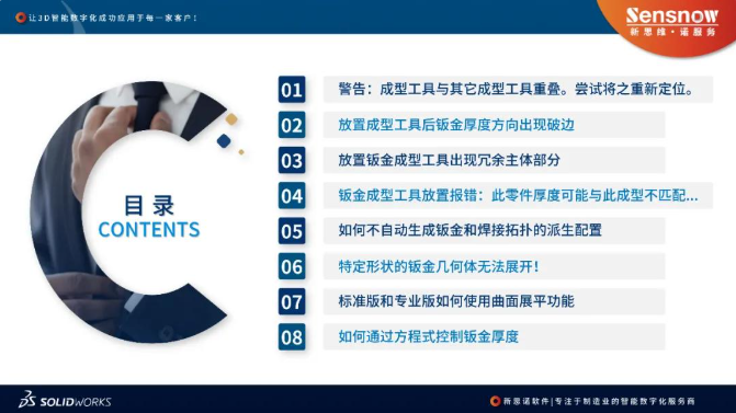 在日常使用SOLIDWORKS进行钣金设计时,你是否常被一些突如其来的报错或拓扑问题困扰?例如成型工具重叠导致警告频发、钣金展开失败、厚度方向出现破边等。这些看似细节的问题,实则直接影响设计效率与模型精度。新思诺聚焦近期用户反馈集中的八大钣金拓扑热点——从成型工具定位冲突、厚度与曲率半径匹配逻辑,到派生配置冗余控制、特殊几何展开限制等,深入解析其成因并提供解决思路,助你避开设计陷阱,提升钣金建模的流畅性与可靠性。