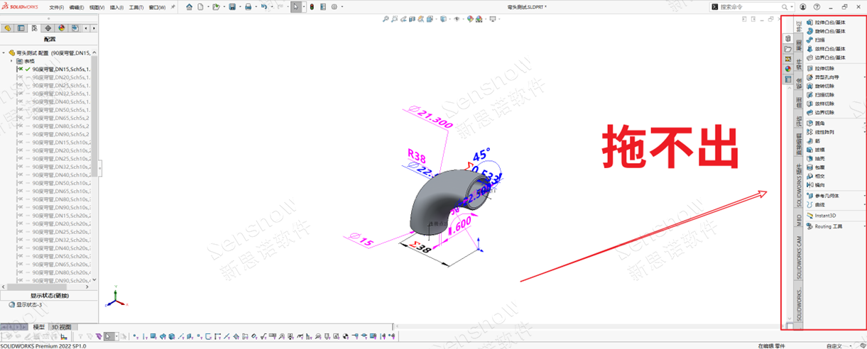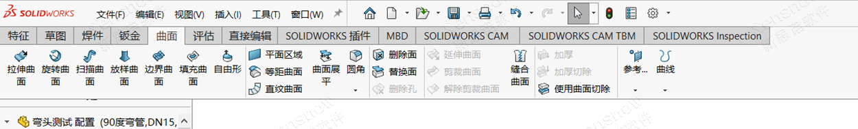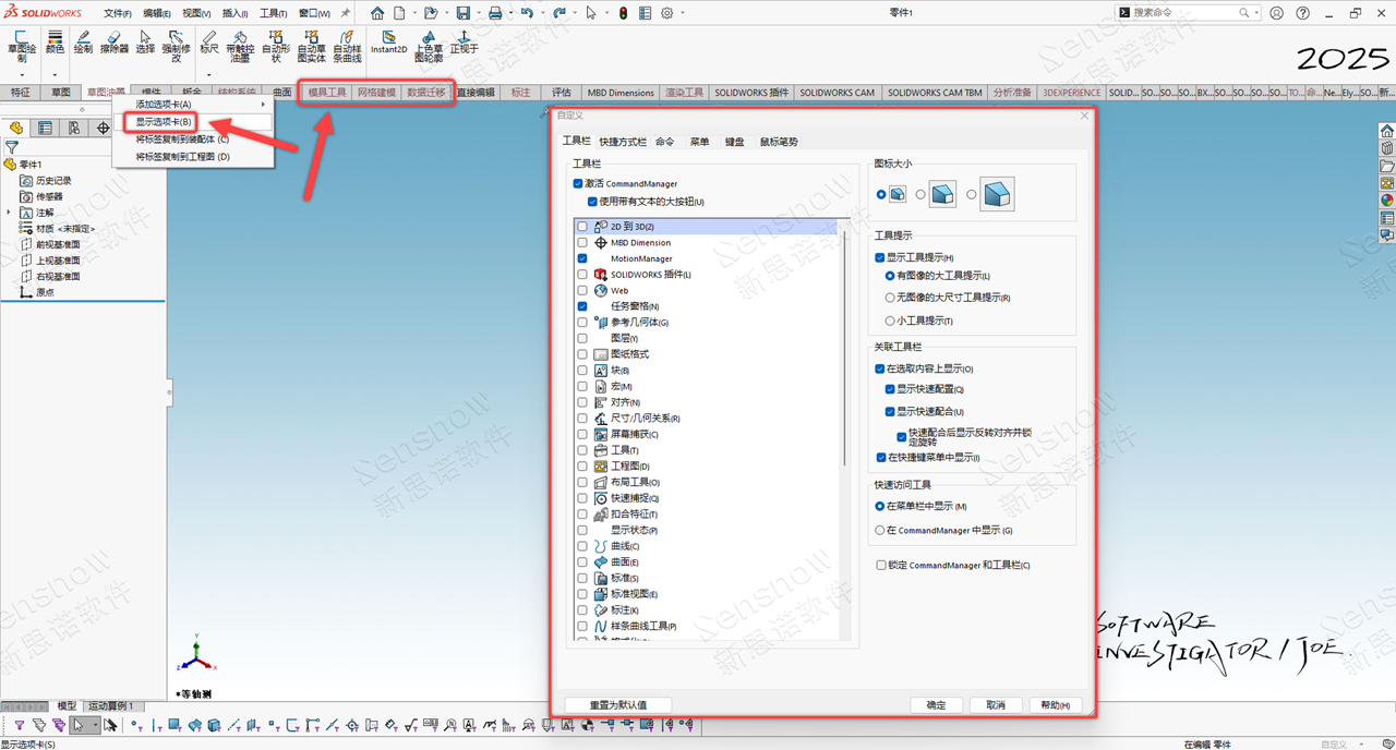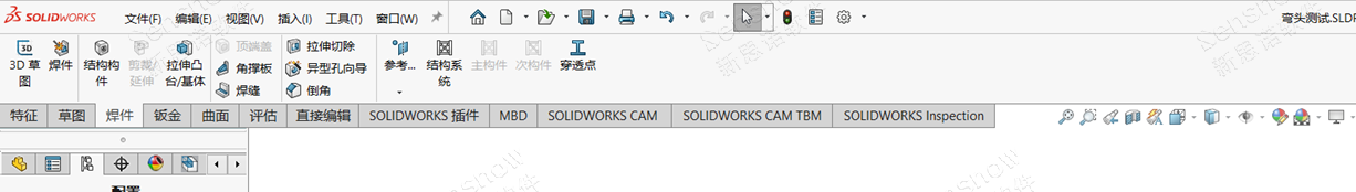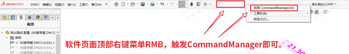 此处为 SOLIDWORKS 2021 版本增强功能【可折叠的CommandManager】,此功能与我们 Office 文档同理,是一个折叠功能区,为了展现更大的绘图区域,让不同习惯的用户可以自由切换。由 CommandManager 按钮区域页面右下角的小按钮进行控制;