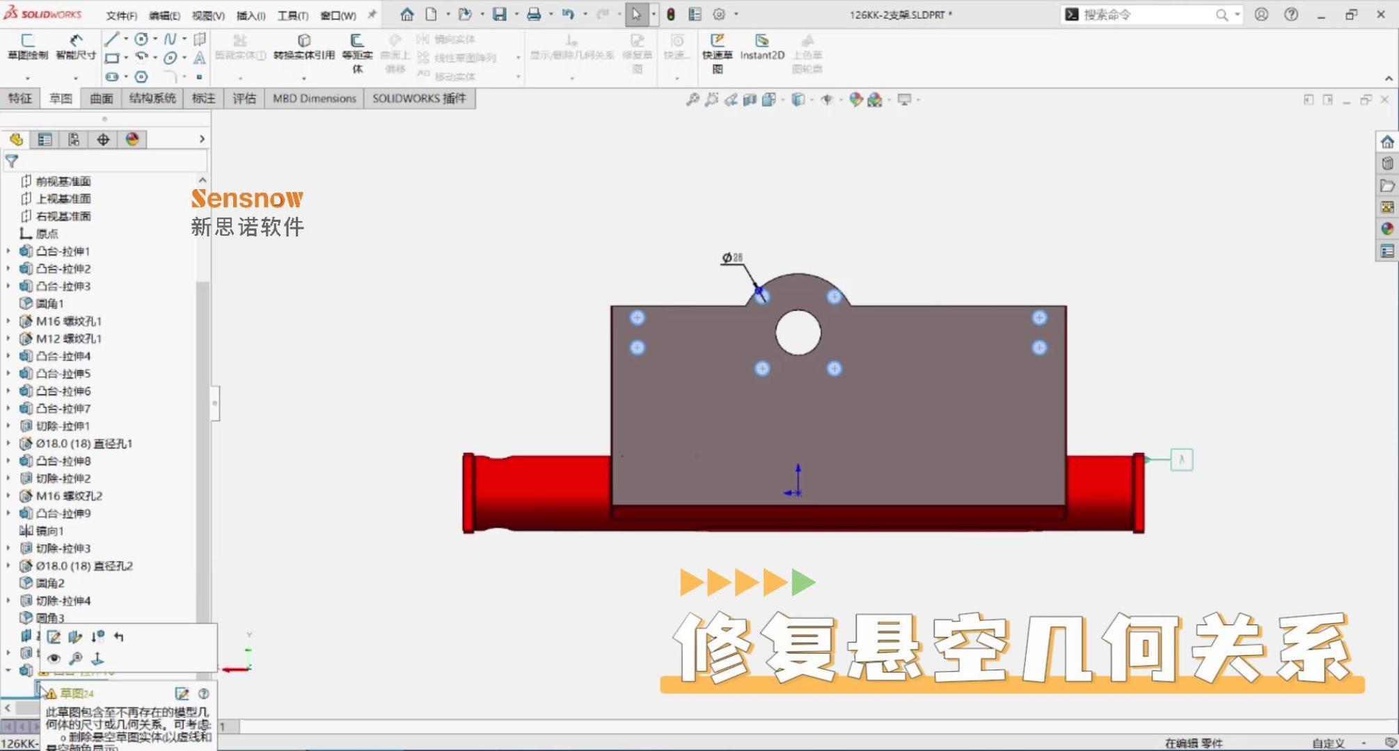 修复悬空几何关系可对存在悬空几何关系的草图中一键设定[修复所有悬空],软件后台的强大求解器将开始工作,在丢失参考的悬空中查找相同位置的点、线、面来自动修复所有悬空的几何关系,减少了大量的人工修正时间。