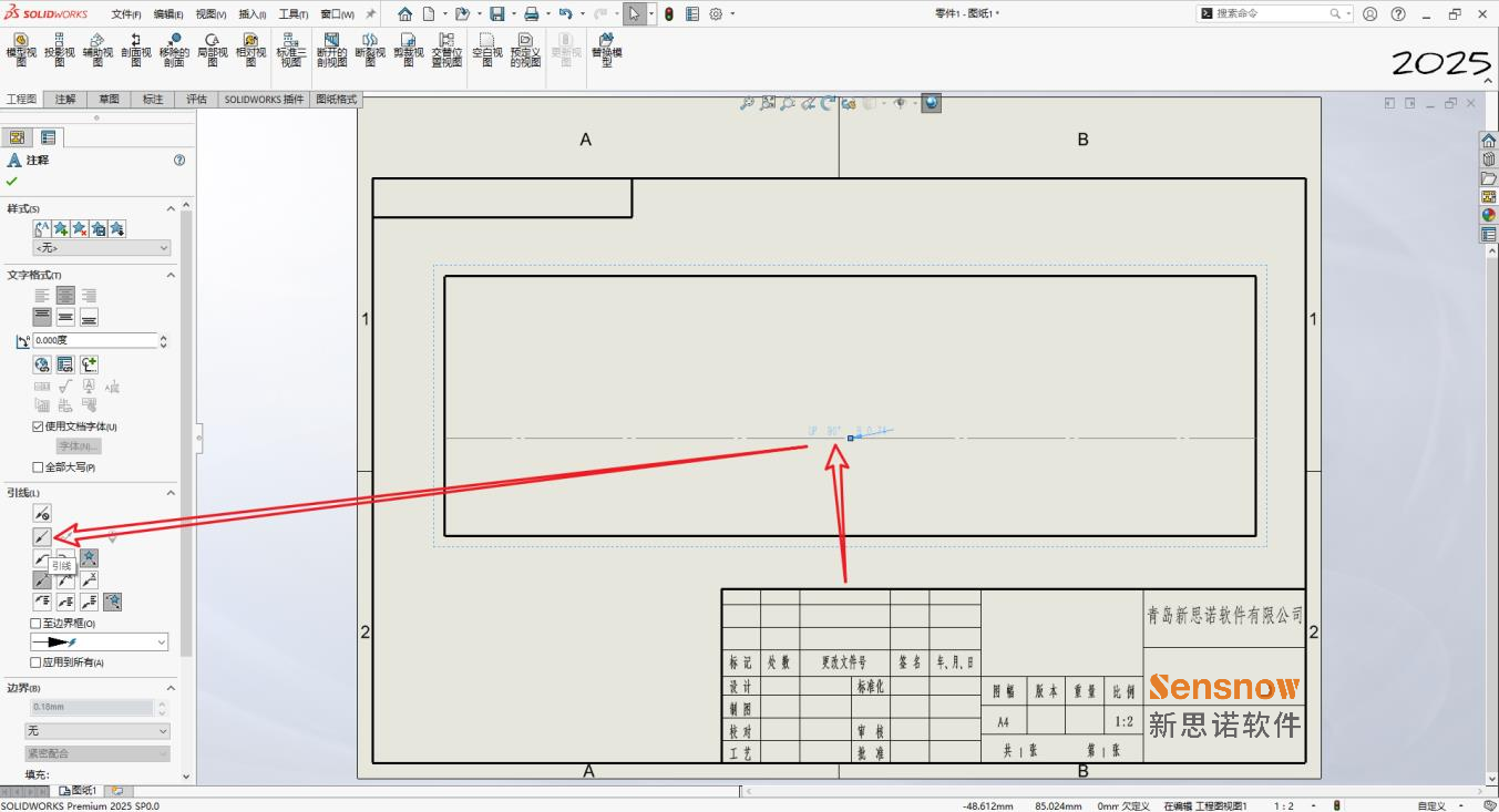 1、点击折弯注释,在左侧属性标签中点击设置注释引线;