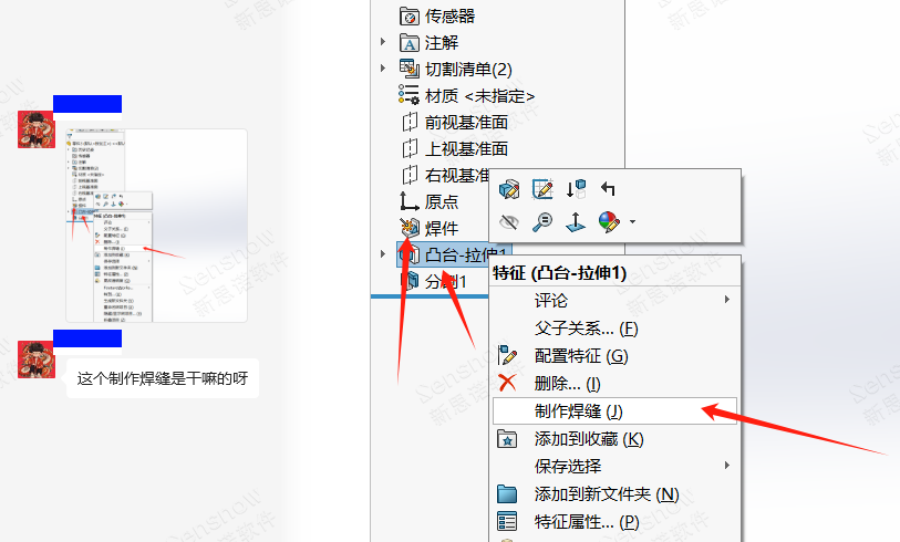 客户在设计焊接件的时候无意中在 FM 设计树上看到了'制作焊缝'/'制作非焊缝'这两处选项,十分好奇,但是实际测试后没有测试出结果。