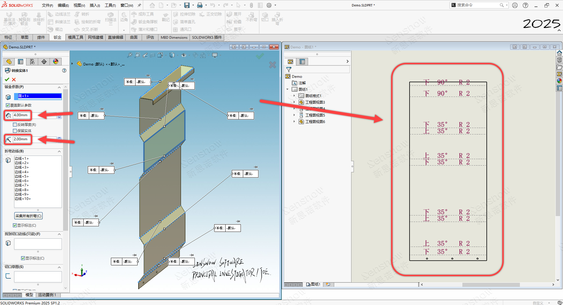 打开客户对应的三维模型观察这些在工程图视图中出现 '尖角' 的折弯几何体,发现没有半径值!这或许是造成问题的根本原因,再观察 FM 设计树发现模型文件是外部输入图档输入进来的几何体转换为了钣金拓扑。