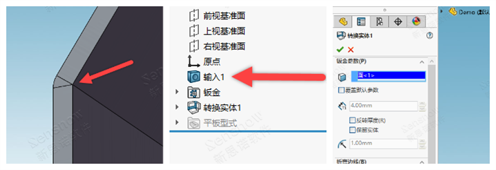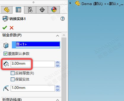 解决方案也很简单,要么将钣金的厚度更改为原始外部输入图档的 '3' 毫米,这样就会沿用输入件的半径值不会出现内侧折弯半径值为零的现象了。