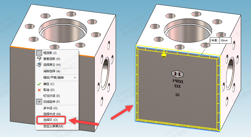 '环' 指的是首尾相连但不一定相切的边,即为封闭图形,一个圆圈可以是环、一个多边形也可以是环;只要首位相连且封闭都可以称之为环。使用方式非常简单:在图形区域形成环状的模型边线上右键菜单点击 '选择环' 即可完成一个环的选择。
