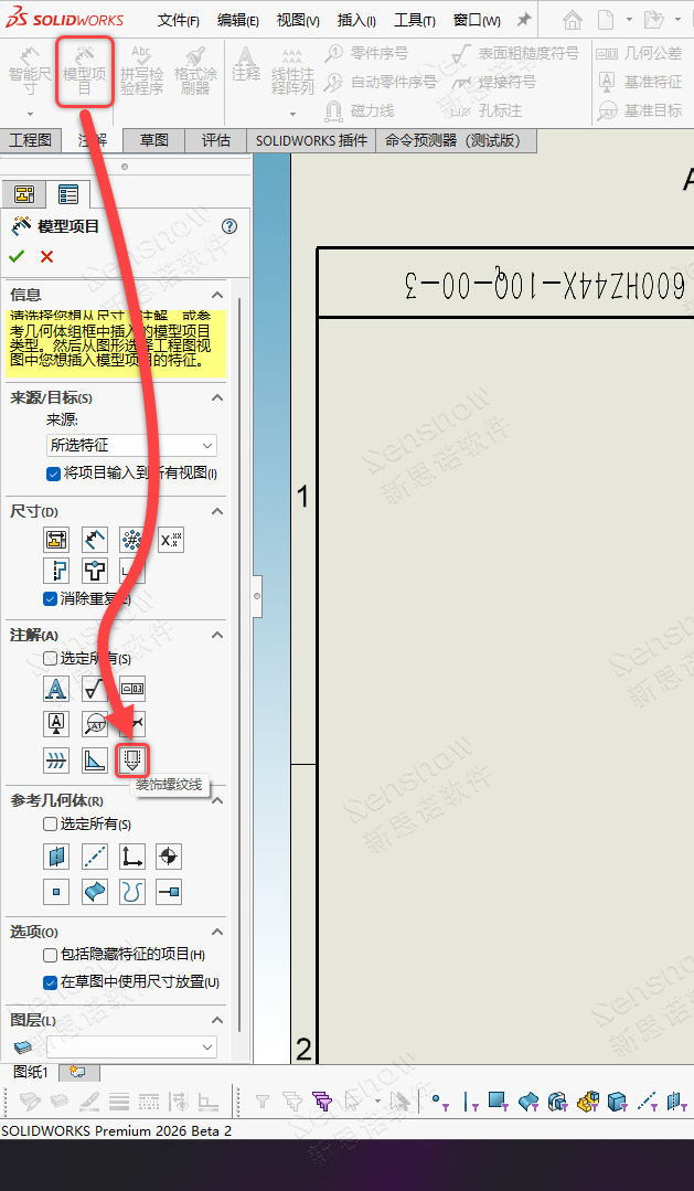 关于装配体工程图,默认是不显示零件中的装饰螺纹线的,如若要在装配体工程图中将其显示则可使用“模型项目”勾选装饰螺纹线,在图纸中创建并显示零部件的装饰螺纹线。