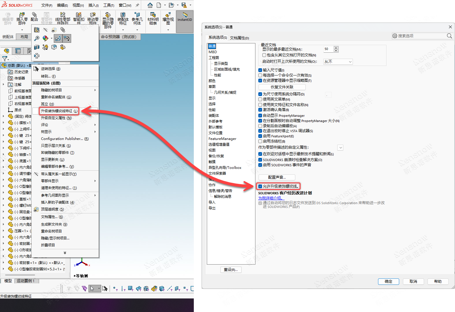 可对零件和装配体三维模型在 FM 设计树顶层图档名称中执行右键菜单 -> 升级装饰螺纹线特征;工程图装饰螺纹线问题也可打开对应的三维模型(零件或装配体)后执行此操作。